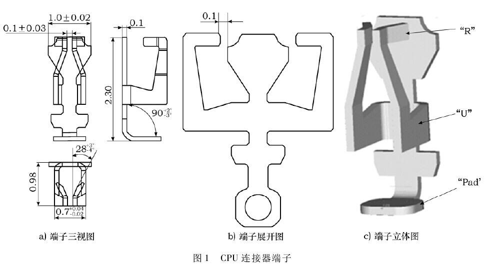 CPU連接器端子,材料為磷青銅(C7025 TM03),厚度為0.1mm,產量需求為每天6000萬件。零件主要技術要求勻”形寬度為0.7mm(見圖1a),正位度;"R”形角度為28;...
